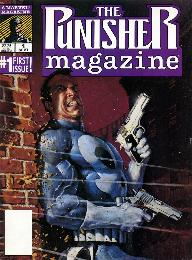 PUNISHER MAGAZINE Vol 1 #1, October 1989 issue - COVER: Mike Zeck (pencils) Mark Texeira (painting) Reprints the first issue of the Punisher 5-issue Limited Series by Steven Grant, Mike Zeck, and John Beatty.