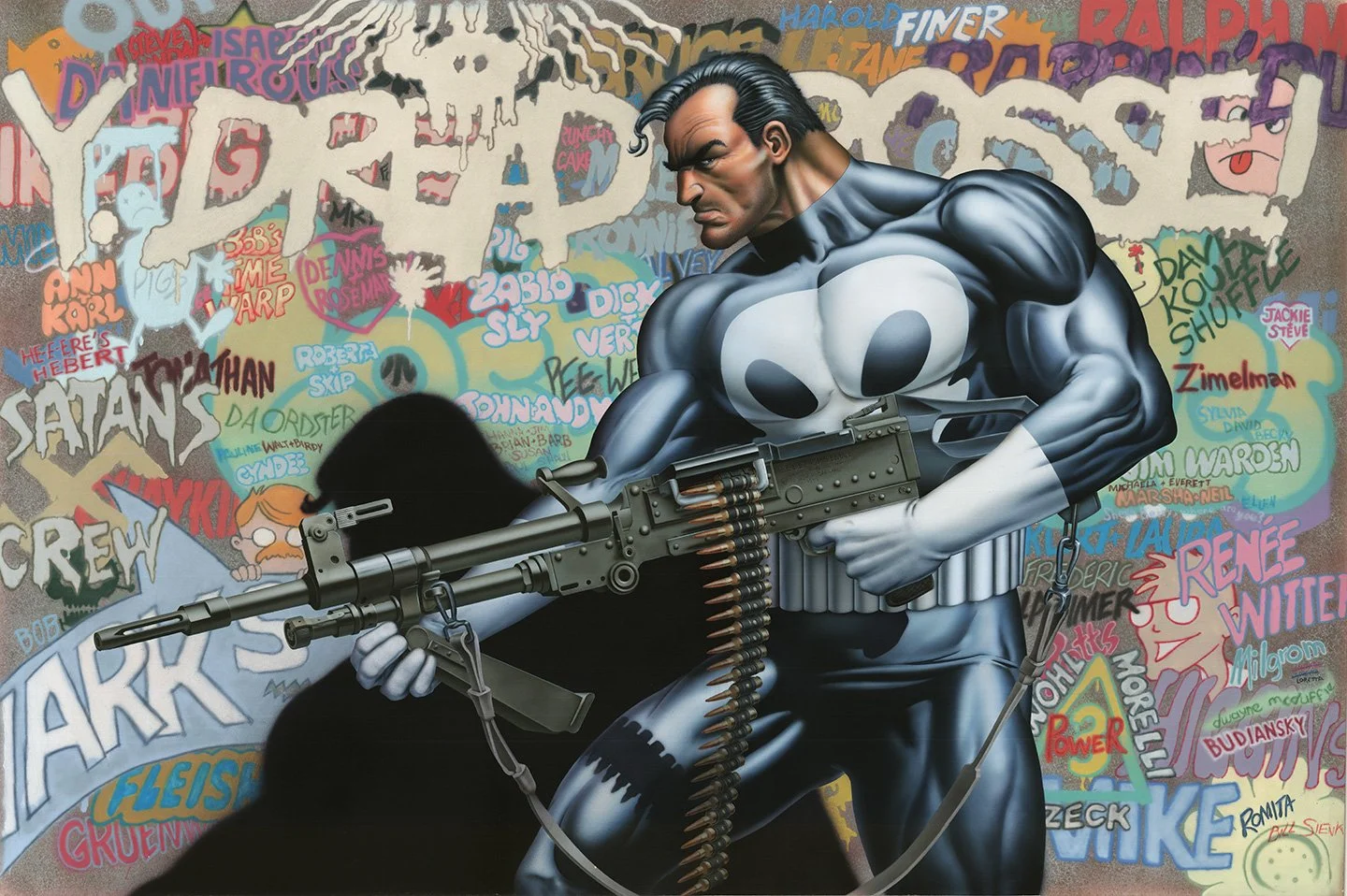 PUNISHER POSTER 1 - My first collaboration with airbrush painter Phil Zimelman. Originally intended to be the first cover of the Punisher Limited Series, the editor decided it would make a good on-sale poster, so we went with that idea.