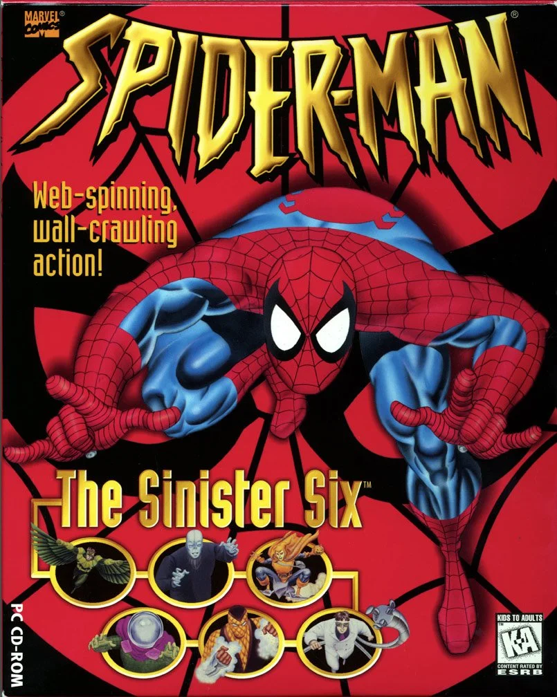 SPIDER-MAN: THE SINISTER SIX, CD-ROM computer game, 1996 - Box cover art by Mike Zeck (pencils) Phil Zimelman (airbrush painting). Box art is also used for the CD case insert.